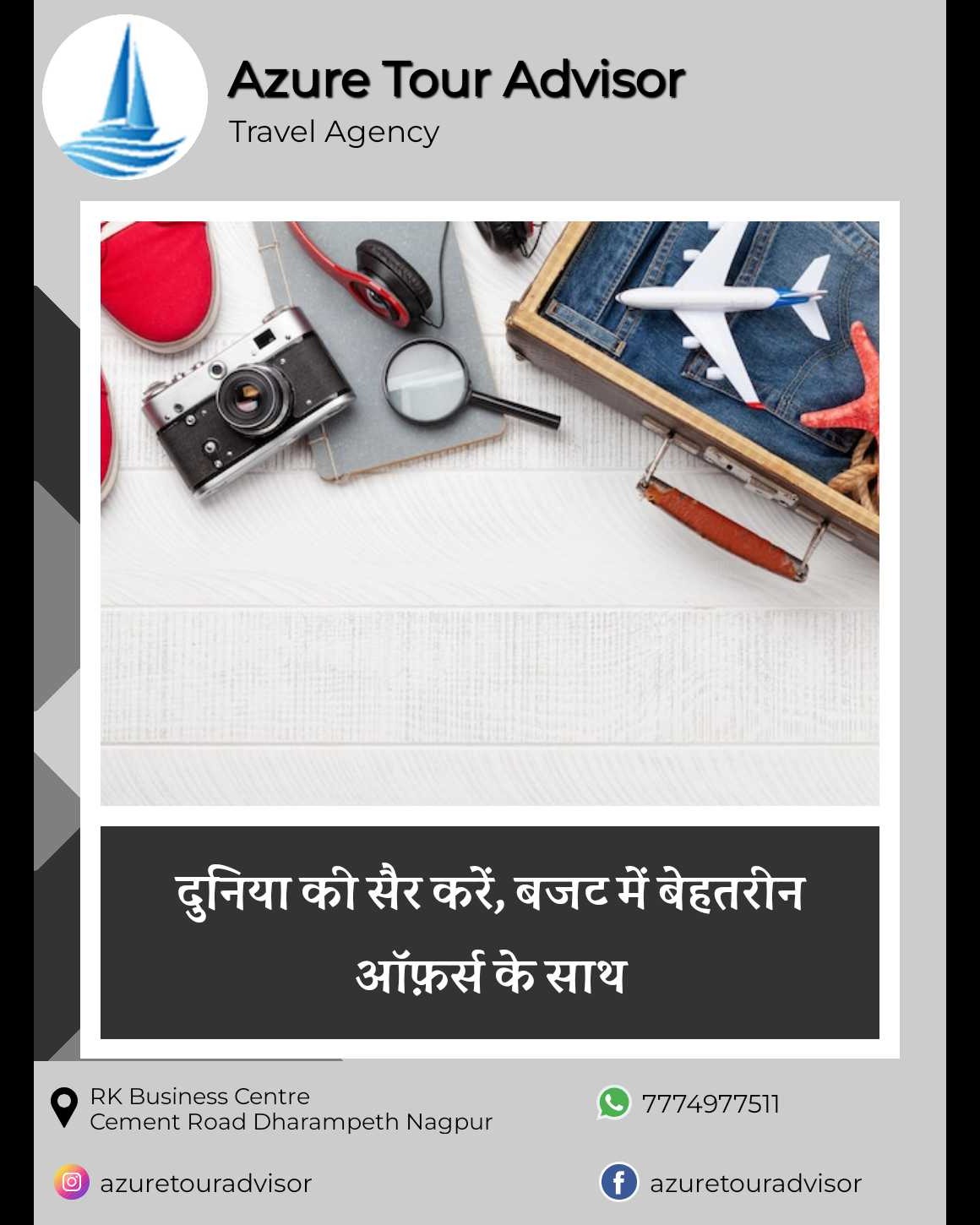 Book Your Domestic & International Packages. We are Azure Tour Advisor. A Travel company based in Nagpur. We deals in Domestic and International tour Packages. If you have any requirement please contact us. Ph : 7774977511 Our Services : Flights. Packages. Visa. Sightseeing. Tours. Local Transport. Meals. Best Tour Operator in Nagpur. Best Travel Agency in Nagpur. Tour Operator in Nagpur. Travel Agency in Nagpur. Domestic Tour Packages. International Tour Packages. Domestic Tour Operator in Nagpur. International Tour Operator in Nagpur. Domestic & International Tour Operator.